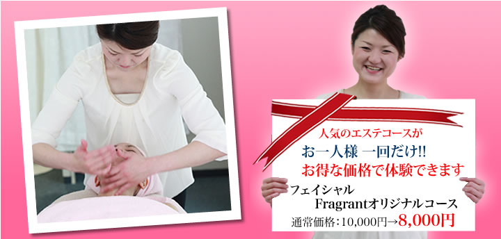 フレグラントの店内資料・PR広告等に登場していただける方を大募集!モニターに参加していただいたお客様には、フレグラントのフェイシャルFragrantオリジナルコースがお得な価格でお受けいただけます。